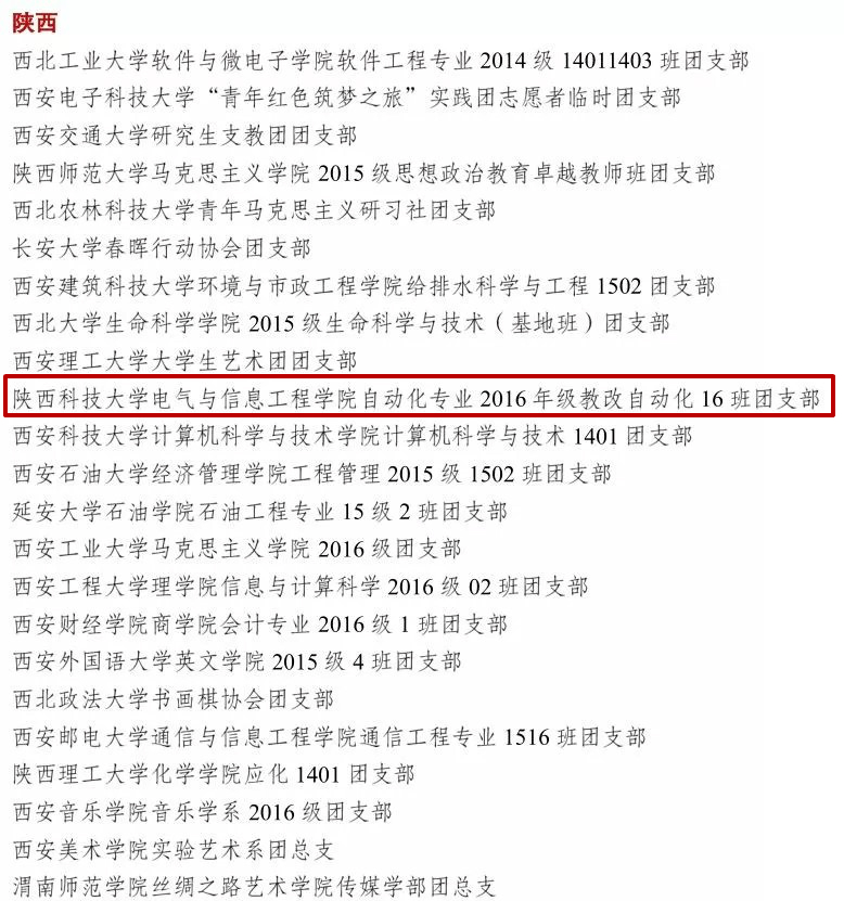 为贯彻落实《高校共青团改革实施方案》有关精神,深入实施高校基层团支部“活力提升”工程,团中央学校部于2017年秋季学期开展高校“活力团支部”创建遴选活动。本次全国遴选活动共有7000多个团支部参加,经校内创建、省级遴选、网络投票等环节,最后仅有1000个入围并获得“活力团支部”称号,陕西省共有36个团支部获此殊荣,教改自动化16支部是我校唯一入选的团支部。