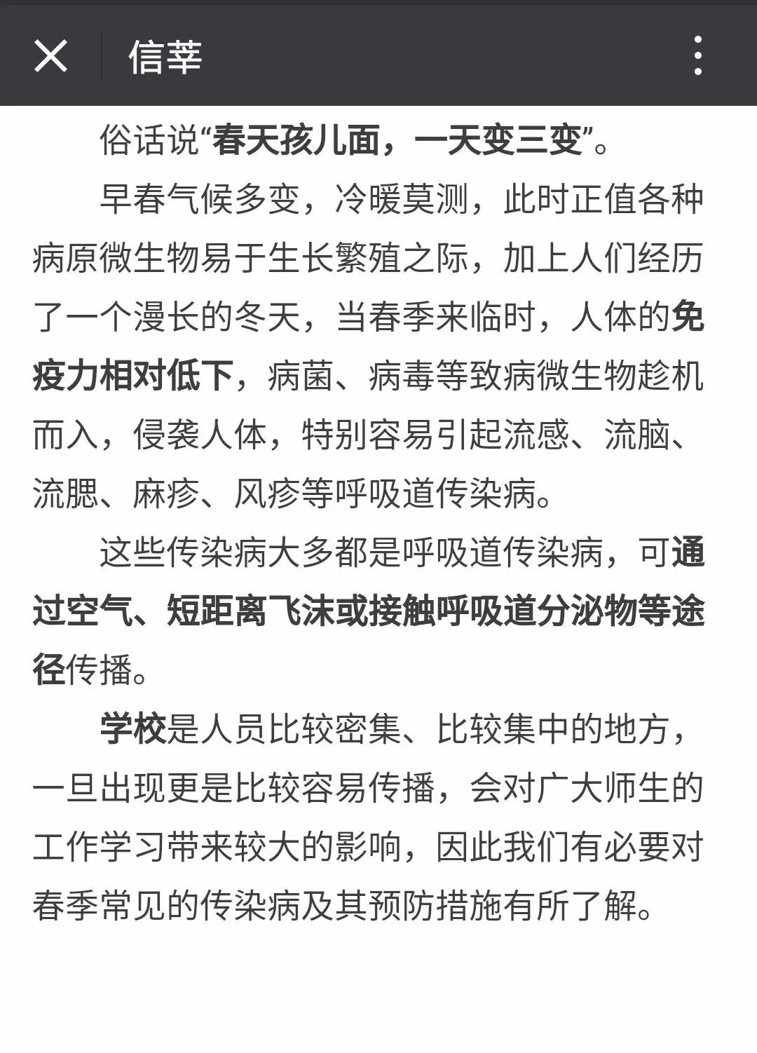 开学前,利用学院官方微信平台“信莘”、易班、学生QQ群等全面开展安全教育,重点对财物安全、防校园贷、兼职安全、传染病预防等内容开展线上安全教育。开学第一周,由各班辅导员召开安全主题班会,以学生实际情况出发,有针对性的开展春季安全主题教育,引导学生提高思想认识,杜绝安全隐患,做到防患于未然。