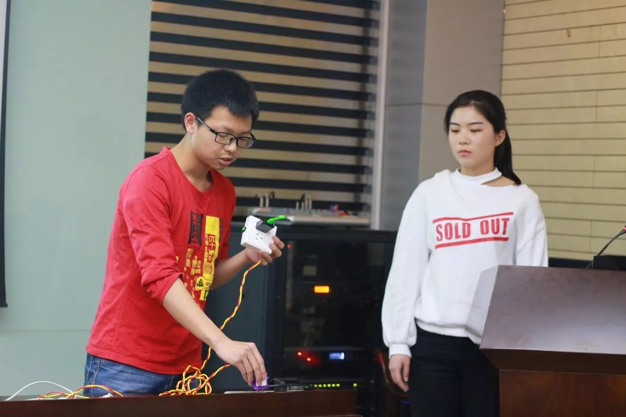 最后出场的是来电断电开关:突然断电给学生学习生活带来极大的不便,而突然来电也会让用电器工作从而造成安全隐患,来电断电开关从宿舍生活出发,解决现实问题,让学生远离断电来电所造成的安全隐患。这是这几组中年纪最小的参赛选手,他们作用自己大一所学的知识,结合自己在生活中的一些想法,做出了这个作品。这个作品从现实出发,实用性很想,获得了评委老师的青睐。