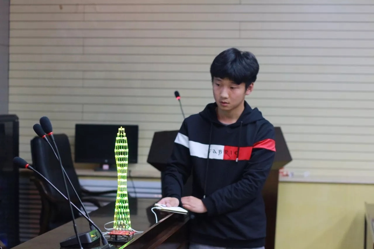 坐落于羊城的地标性建筑广州塔绚烂多彩,接下来上场的罗驰同学团队采用74HC573锁存器扫描控制256个LED灯,又同时加入了红外线接收模块和wifi模块远程遥控控制和手机控制着动画美轮美奂的广州塔模型。三色交替,动画随意切换的模型成为本次比赛的一个亮点,他们希望自己的作品可以被广泛应用,他的答辩得到了各位评委老师的一致好评,对于老师们提出的问题,他也能对答如流,自信从容。