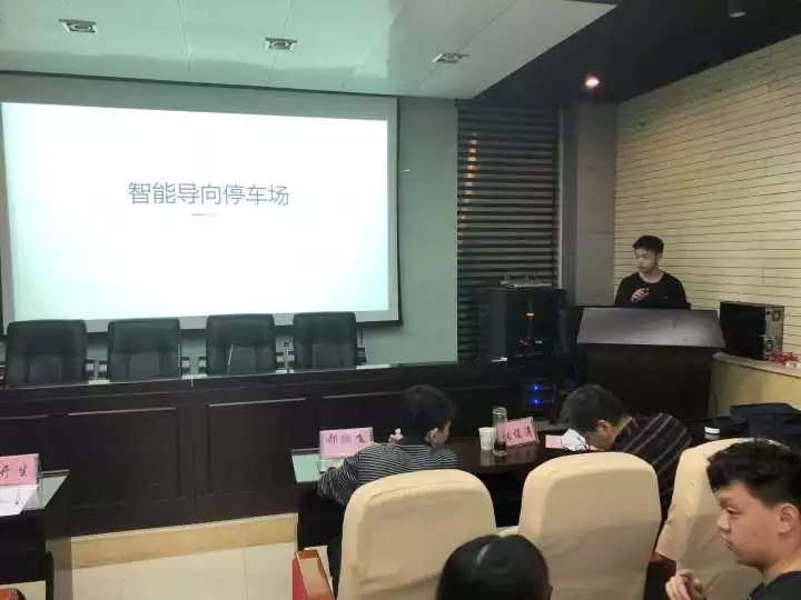 “智能停车场”团队答辩者经过充分的准备,简单用PPT说明了自己的设计理念和设计方法,他们实现了多车同时导航,临时修改路线和车位预订等功能,他们的技术还申请了专利,他们的产品内容新颖,答辩言辞流利,赢得了评委老师的一致赞赏
