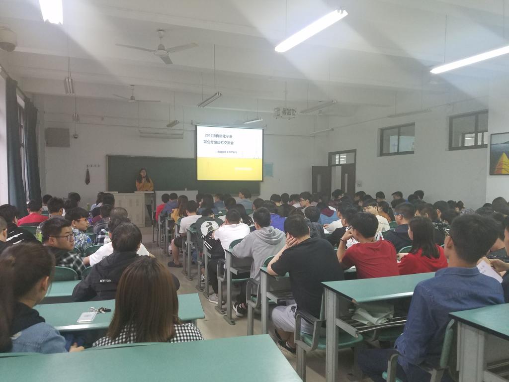 4月23日,电气与信息工程学院15级自动化专业考研就业经验交流会在教学楼C302举行。本次会议由学院辅导员任欢老师主持,2014级2名本科毕业生代表以及15级自动化专业全体学生参加了交流活动。