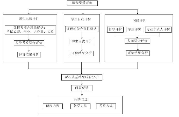 课程质量评价是理论和实践教学的教学活动(包括考试试卷成绩及分析报告、平时表现、作业、大作业、实验报告、实习报告、设计报告、答辩记录、毕业论文等),采用课程成绩结果等材料来进行评价。对于课程质量通过课程问卷,进行学生自我评价。通过督导、学生、专业负责人的评价表的结果进行课程质量的客观评价。